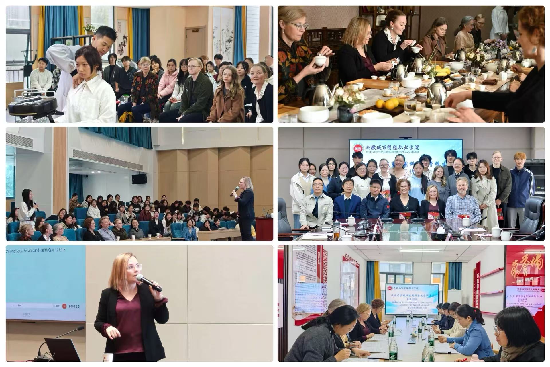 访问期间,代表团一行走进智慧康养专业课堂,观摩教师现场教学,直观感受我院实践教学特色;沉浸式体验中国传统茶艺文化,增进对中华传统文化的认知。芬兰城市应用科学大学老年护理专业负责人、高级讲师Anna受邀作专题学术讲座,围绕老年护理前沿理念与实践展开深度分享。双方教师聚焦中外合作办学、课程共建、师资交流等关键议题,展开务实研讨。此外,代表团还赴滨湖雅园康养产业有限公司、静安养亲苑等本地标杆养老机构实地考察。